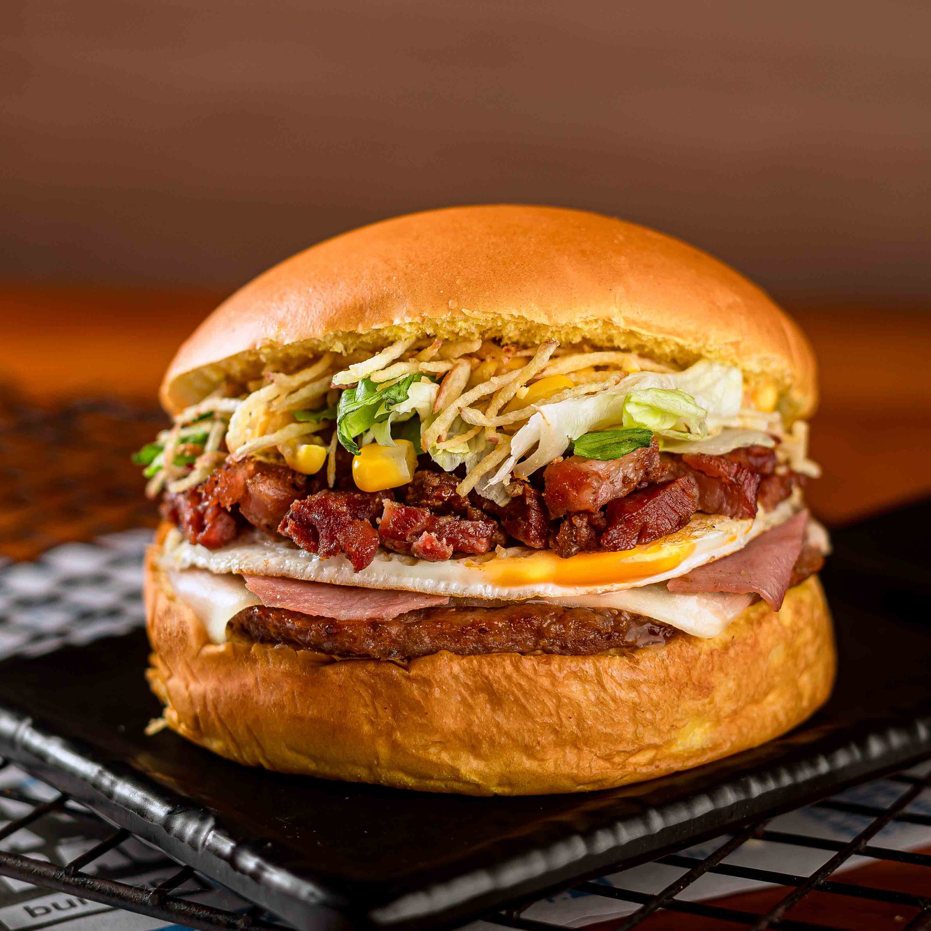 Pão, bife, queijo, presunto, ovo, bacon, alface, milho e batata palha